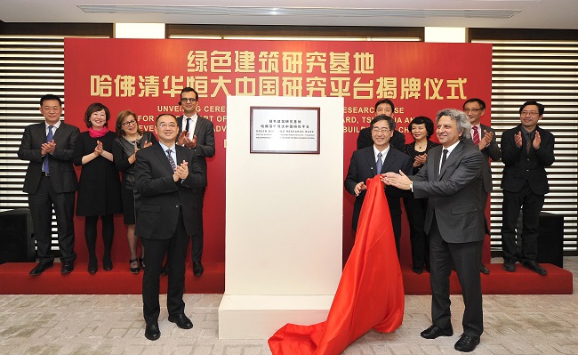 哈佛大学设计学院院长Mohsen Mostafavi,清华大学副校长姜胜耀,恒大集团董事局副主席、总裁夏海钧博士出席了仪式,并共同为绿色建筑研究基地揭牌。哈佛大学设计学院教授、哈佛恒大绿色建筑研究中心主任Ali Malkawi,清华大学建筑学院副院长、清华恒大研究院绿色建筑产业中心主任朱颖心,恒大集团副总裁王川分别在揭幕仪式上致辞。