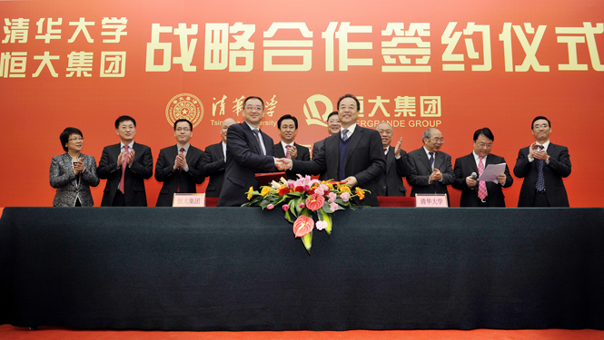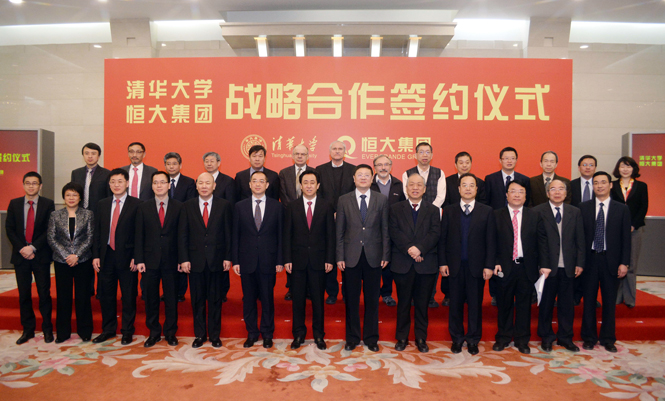 4月8日上午,恒大集团与清华大学战略合作签约仪式在北京人民大会堂举行。全国人大常委、清华大学校长陈吉宁,著名数学家、清华大学数学科学中心主任丘成桐教授,副校长康克军,副校长程建平,中国工程院院士郝吉明,以及清华建筑学院等5大相关学院院长、党委书记共17位领导,恒大集团董事局主席许家印,董事局副主席、总裁夏海钧,董事局副主席、党委副书记李钢及公司各位副总裁,世界三大名校著名教授:美国科学院和美国艺术和科学院院士、美国斯坦福大学教授Richard M. Schoen,澳大利亚科学院院士、澳大利亚墨尔本大学教授、澳大利亚数学学术委员会主席J. (Joachim) Hyam Rubinstein,英国皇家学会院士、英国牛津大学教授、牛津数学物理组主任Philip Candelas等世界顶尖科研机构的著名学者,清华学生代表,以及全国200多媒体记者参加了签约仪式。清华为此次活动出席的领导级别之高,人数之全,近年首次。