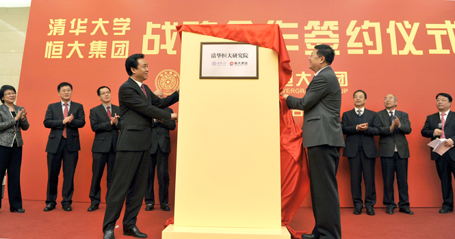 恒大集团董事局主席许家印与全国人大常委、清华大学校长陈吉宁共同为清华恒大研究院揭牌